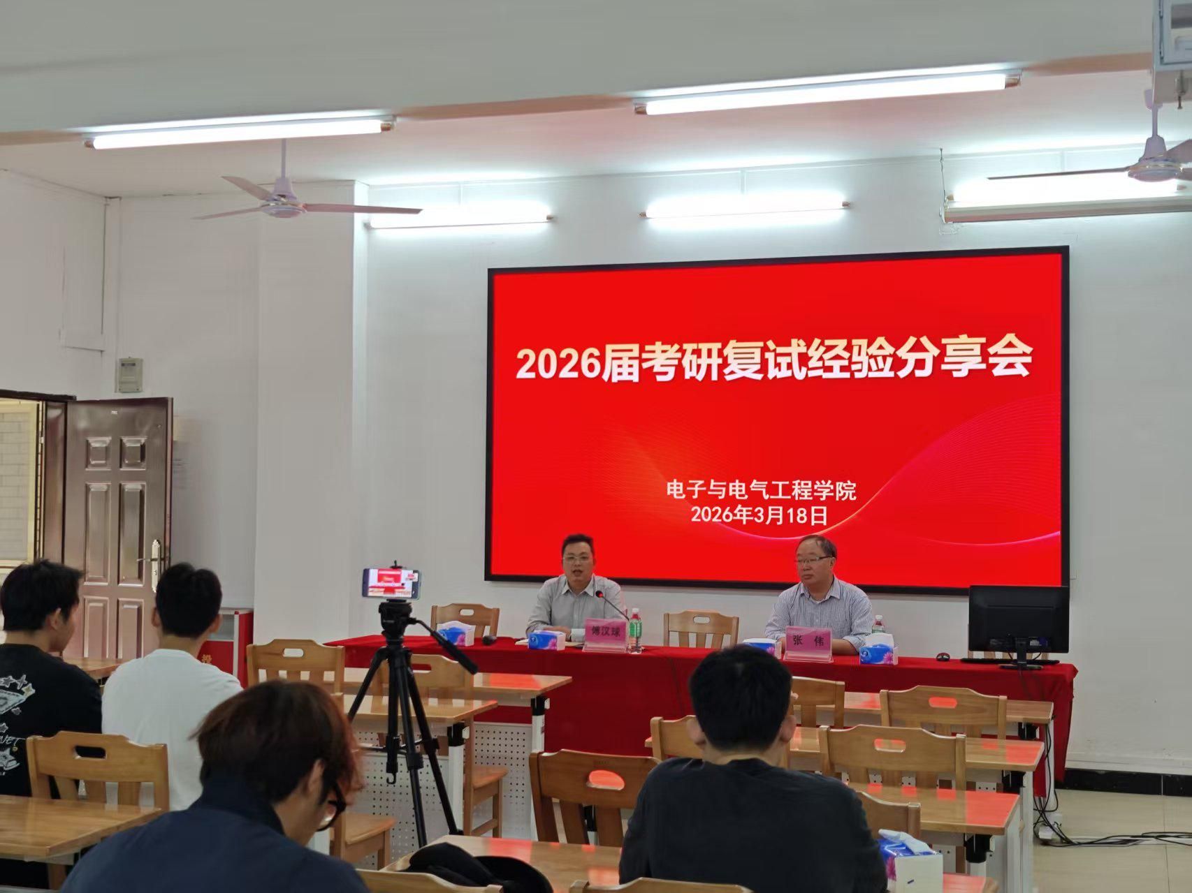 【本网讯】为助力我院2026届考研复试毕业生高效备考,全面提升复试与面试综合能力,切实提高学院考研录取率,3月18日上午,电子学院在实验大楼128会议室举办2026届考研复试辅导交流会。本次交流会采用线上线下相结合的形式,特邀考研复试领域经验丰富的专家导师与优秀研究生代表进行专题辅导与经验分享。