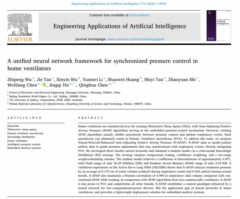 吴志鹏的论文“A Unified Neural Network Framework for Synchronized Pressure Control in Home Ventilators”(《家用呼吸机同步压力控制的统一神经网络框架》)发表在 Engineering Applications of Artificial Intelligence ,该期刊是人工智能领域的重要学术期刊,主要关注人工智能与机器学习方法在工程问题中的应用,为中科院一区top期刊,影响因子8.0。