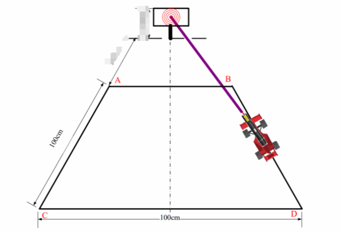 设计制作一个简易方向指向装置,该装置包括自动行驶小车及指向模块两部分。自动行驶小车采用2轮及以上,可采用轮式、履带式结构,机器人的行走方式、指向模块的结构形式均不限制。指向模块以小车为载体,利用一维云台及x轴装有激光模块,利用云台控制激光笔发射激光的方向,使激光光斑落在目标靶上(激光仅用来确认指向方向),如图中小车行驶轨迹外沿为 100cm×100cm 的正方形,边线为黑色,线宽 1.8cm±0.2cm。正方形四个外顶点为 A、B、C 和 D 点。小车可沿轨迹自动行驶,禁止使用循迹模块。小车可以沿行驶轨迹自动行驶,行驶圈数n可在 1~3 之间设定。