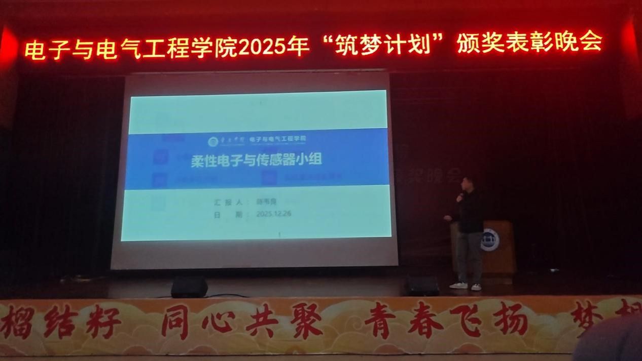在竞赛与科研团队介绍环节,李嘉辉、李博等五位老师分别介绍了全国大学生电子设计竞赛、工科大学生实验综合技能竞赛等赛事成果,以及多个科研团队的研究方向与招新事项,为学生搭建了科创交流平台,激发了大家的创新热情。 颁奖环节成为晚会的高光时刻。与会领导和嘉宾分别为获得科技创新奖、学科竞赛奖、十佳学干奖等多个奖项的个人与集体颁奖,见证了学子们的奋斗成果。获奖学生代表刘建维分享了自己在科研探索、学生工作中的成长经历,寄语师弟师妹珍惜韶华、勇敢追梦。
